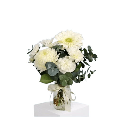 The exquisite Little Darling Mason Jar arrangement from Flowers Across Brisbane is a great example of this. Placed in a mason jar, this all-white bouquet of gerbera, disbud, carnations, and chrysanthemum creates a fresh, clean aesthetic that brings a touch of elegance and simplicity to any space.