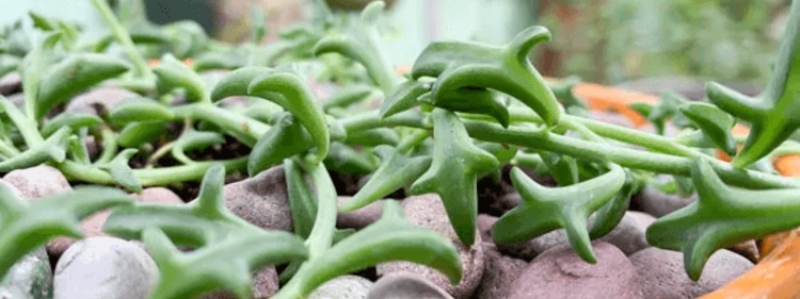 The dancing bones succulent has another interesting name—the drunkard’s dream. This plant’s jointed stems initially grow upwards. Eventually, they drunkenly trail over the rims of hanging pots and baskets. At the same time, this plant got its name “dancing bones” because of its segmented stems that look like bone joints.