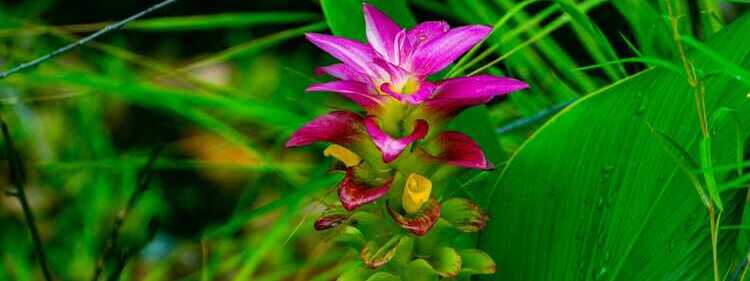 Curcuma australasica is a turmeric plant that produces yellow tubular flowers on an inflorescence that grows in the centre of the plant. On that same flower spike, pink, red, or green bracts grow above the flowers serving as protection for them from stressful environmental factors and pests. The flower spike can reach up to 50 cm high, creating a striking appearance when the flowers are in bloom, which occurs from summer to early autumn.