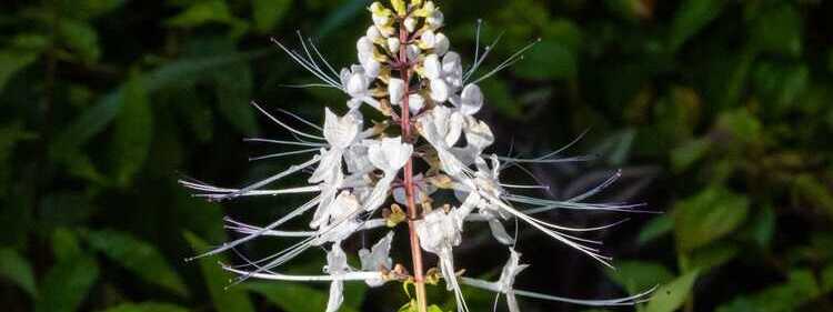 Bearing white or light purple tubular flowers that measure around 2 to 3 cm in length, Cat’s whiskers bloom from summer until fall. The inflorescence can grow up to 30 cm tall and the plant itself often reaches around 2 metres upon maturity. Cat’s whiskers are considered fast-growing plants and once established, they continue growing, producing new stems and foliage year-round in tropical regions.